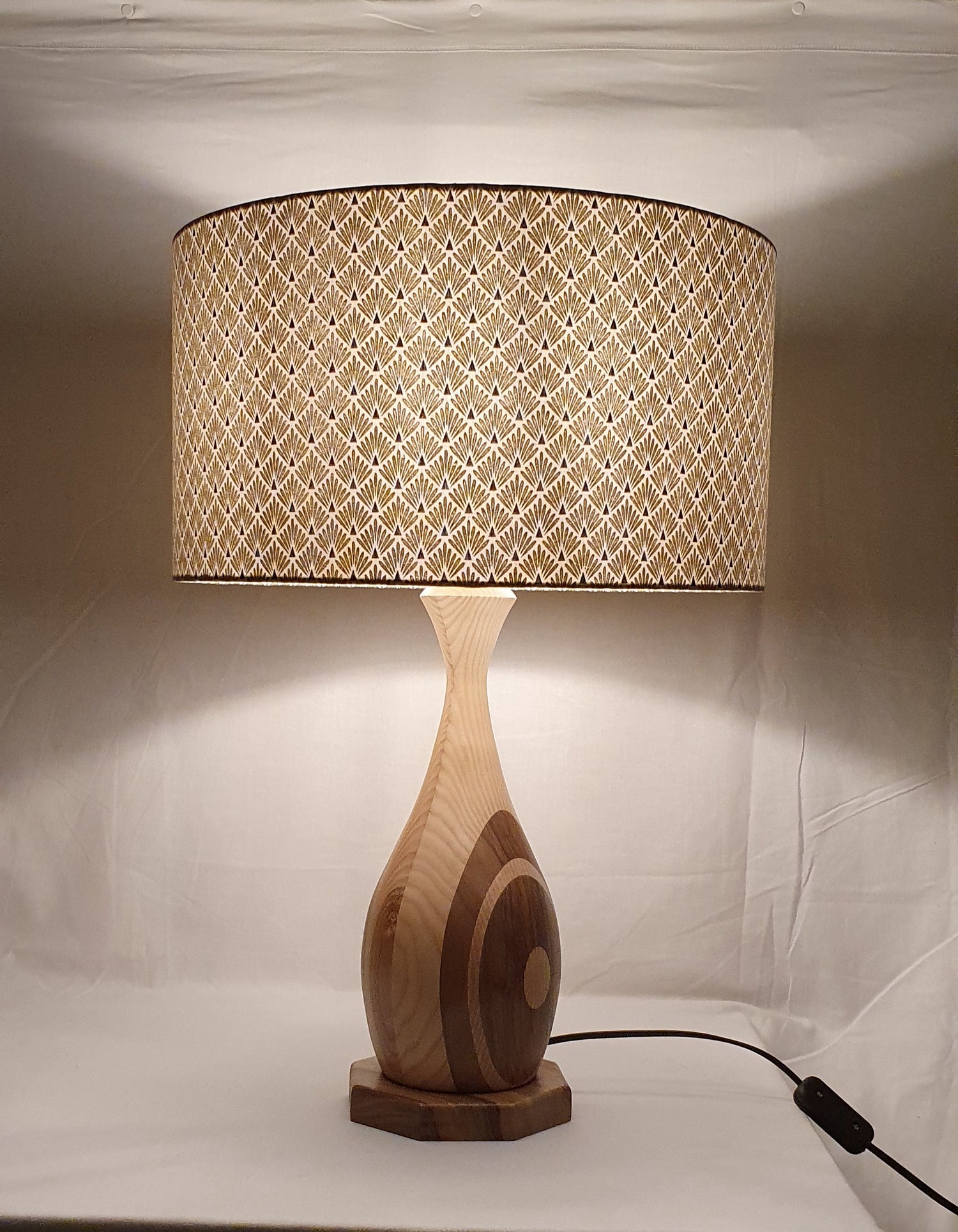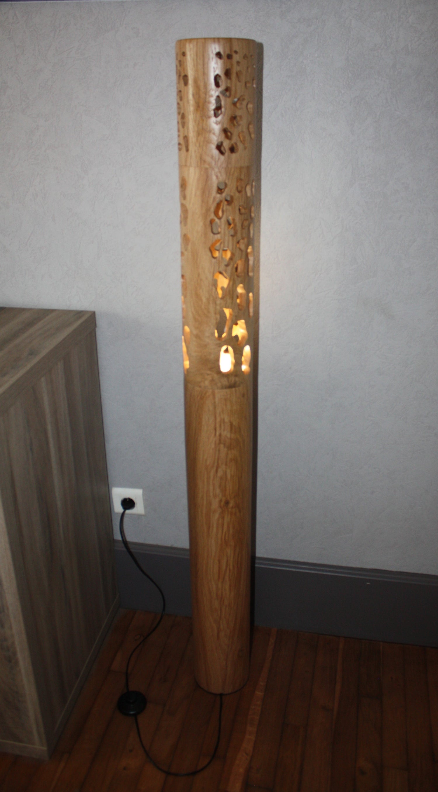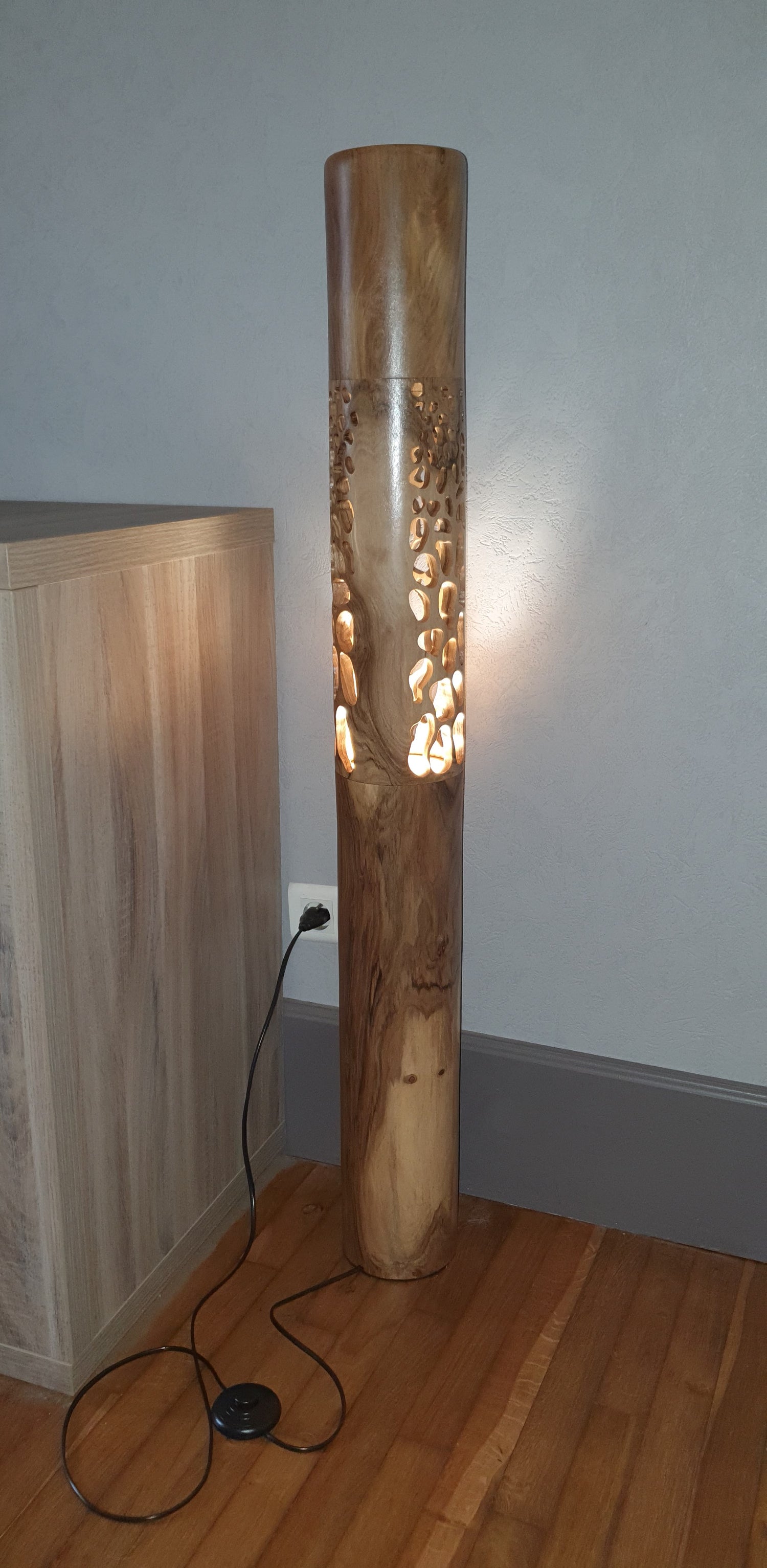 Lampe en noyer, partie centrale ajourée pour laisser passer la lumière. Hauteur 120 cm