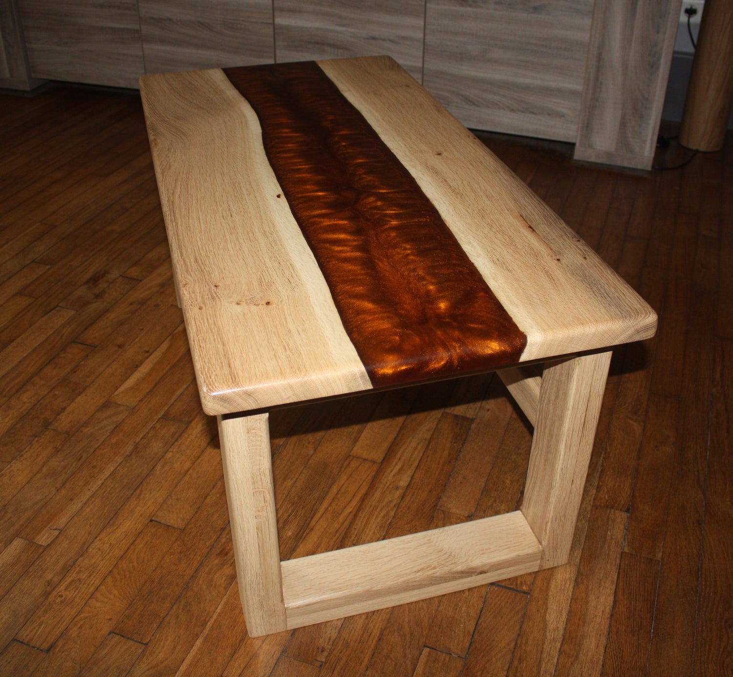 Table basse en chêne et résine avec pigments métalisés "Bronze"