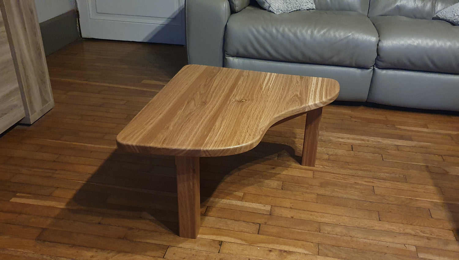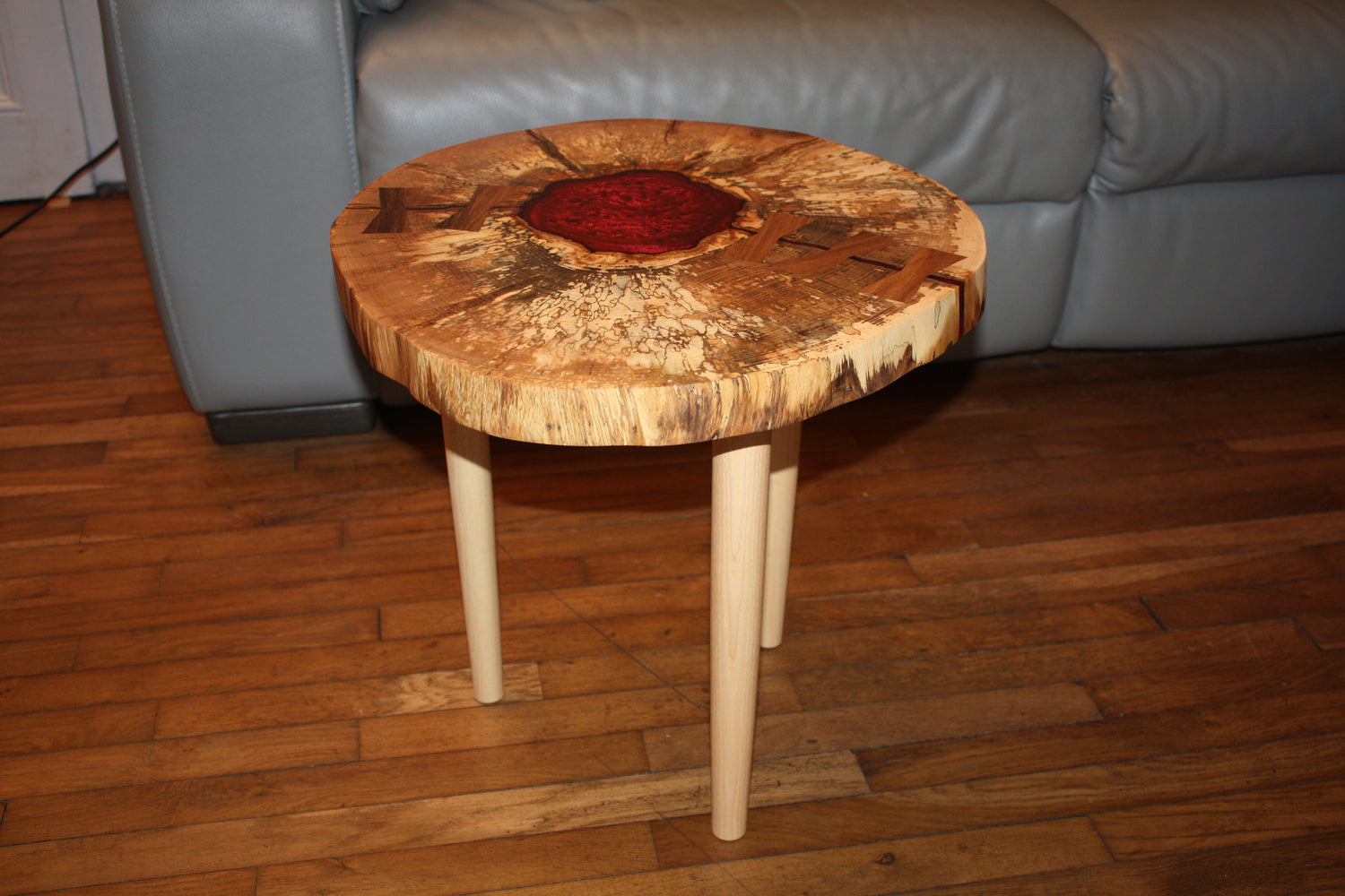 Table basse dans une tranche de hêtre échauffé avec centre en résine rouge métallisée et pieds en frêne.