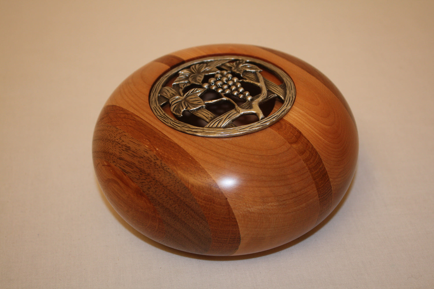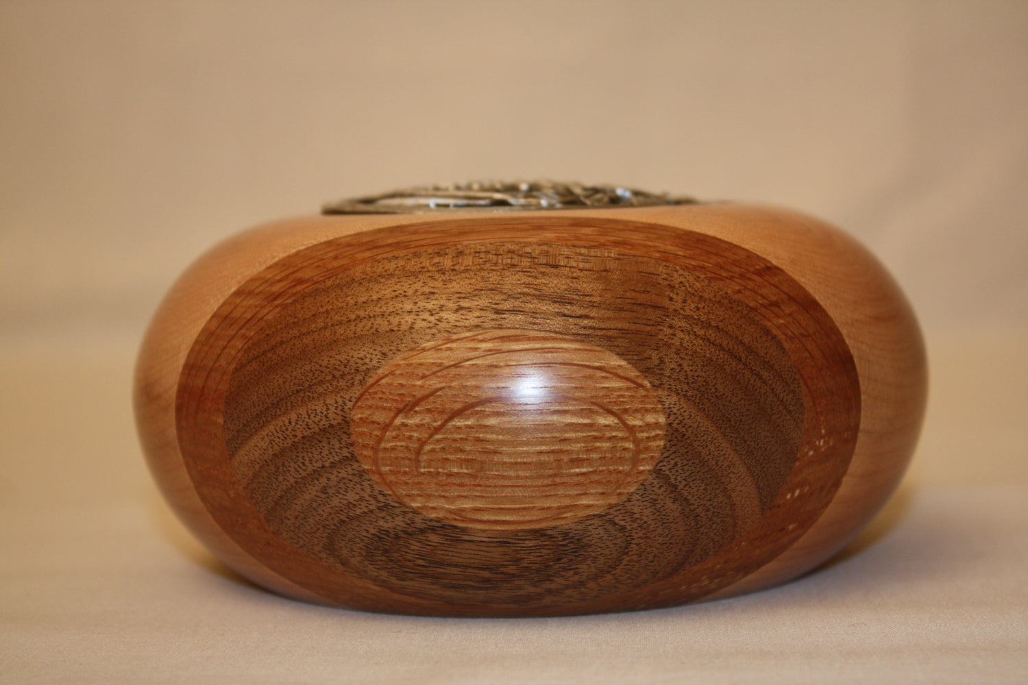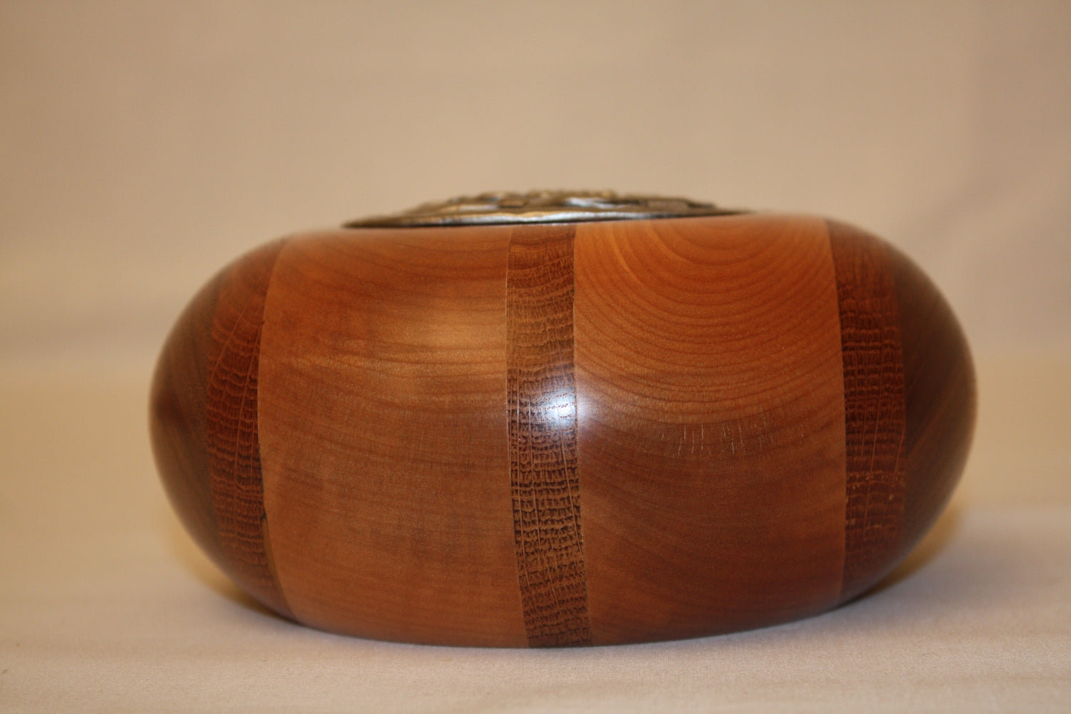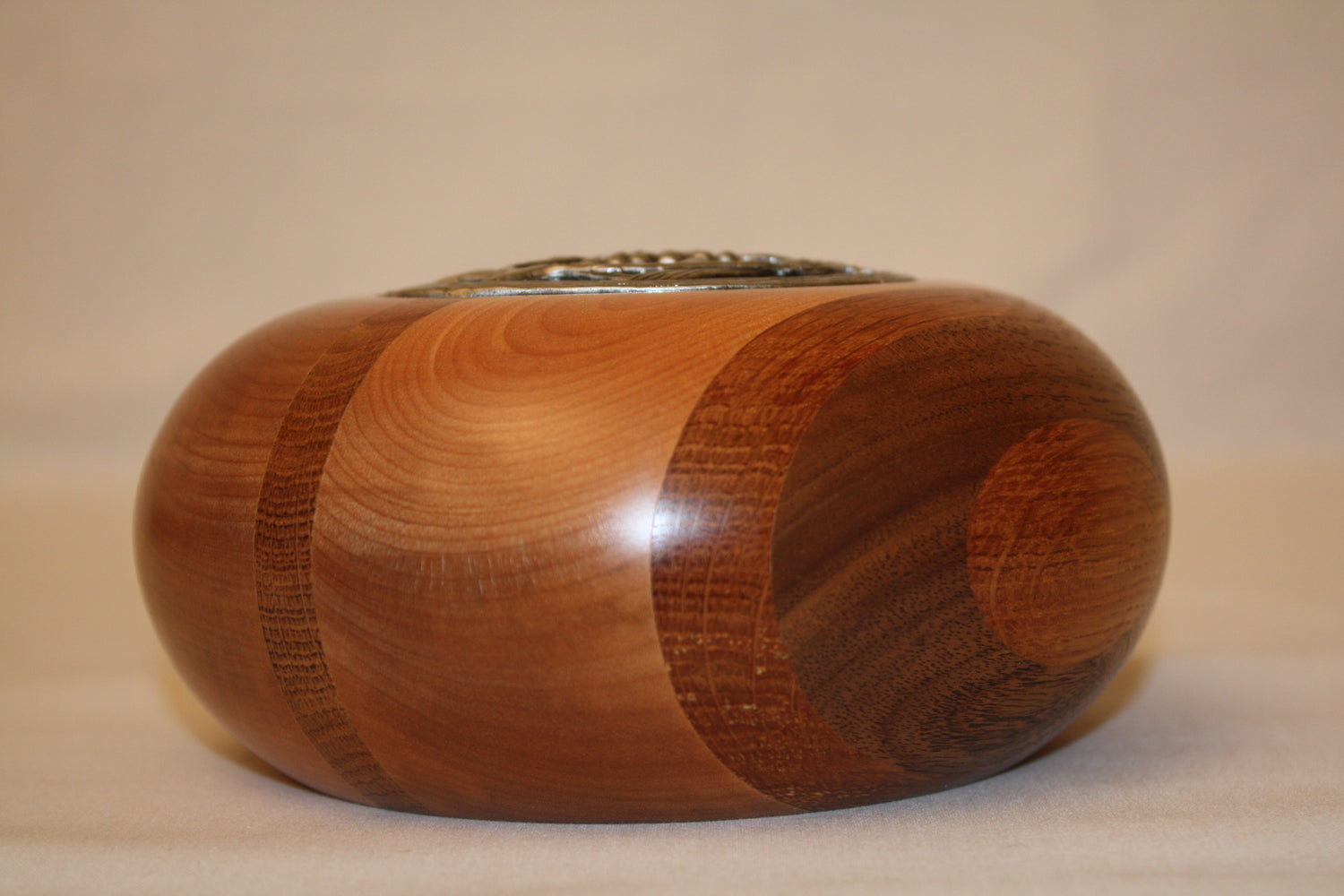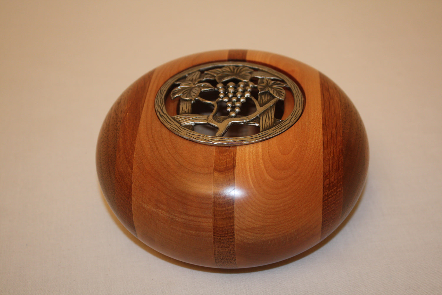 Pot pourri en érable, chêne et noyer avec couvercle décoratif en étain.