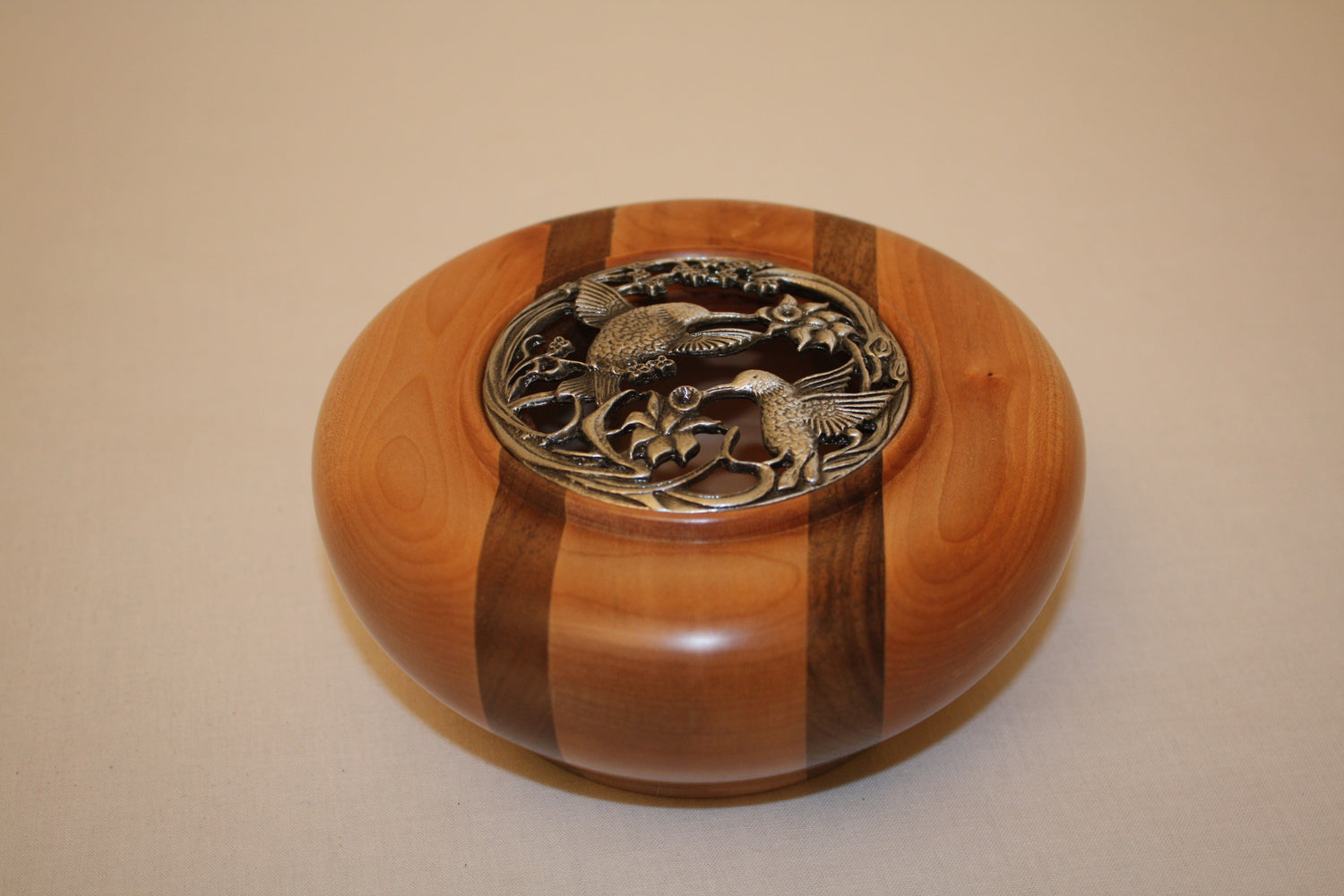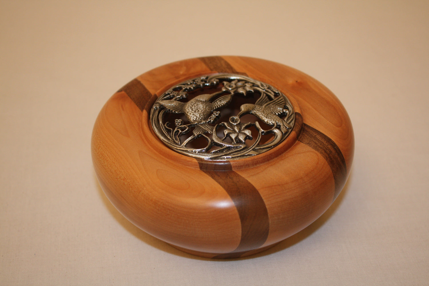 Pot pourri en érable et noyer avec couvercle décoratif en étain.