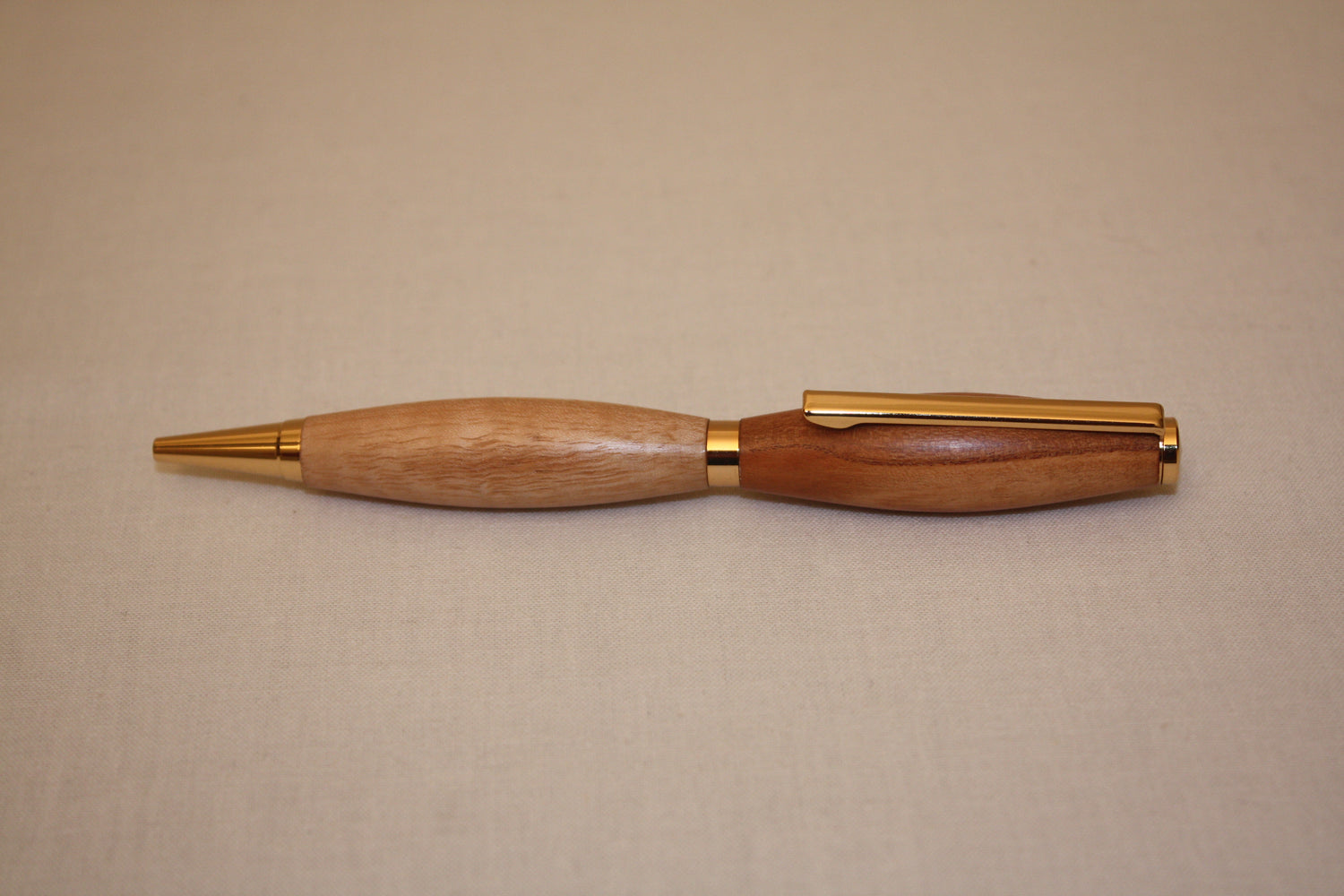 Stylo bille en frêne ondé et merisier avec mécanisme en plaquage or 24K.